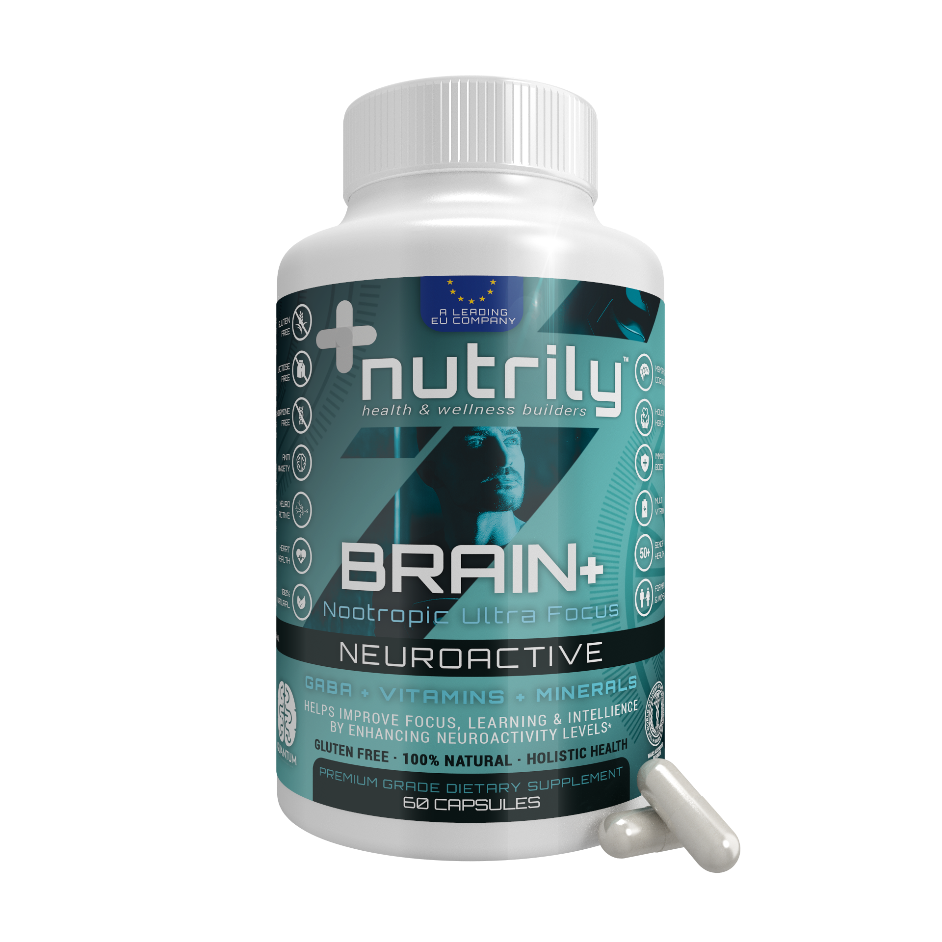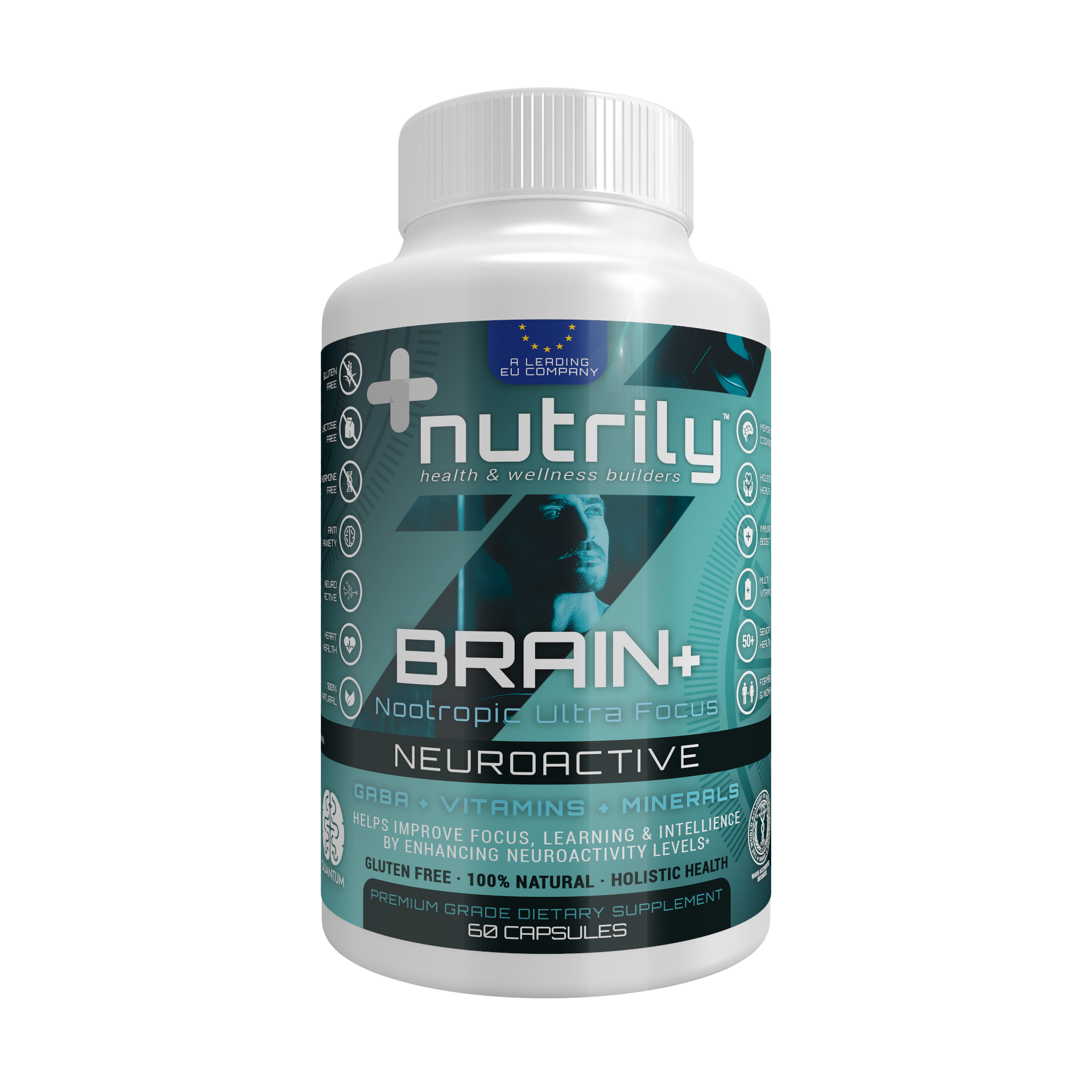 Brain+ Nootropic Ultra Focus – GABA + Vitamins + Minerals is a Nutrily™ dietary supplement that helps improve focus, learning & intelligence by enhancing neuroactivity levels with its neuroactive formula. It’s a 100% natural, gluten-free, lactose-free, and hormone-free nutritional supplement based on a holistic health approach.