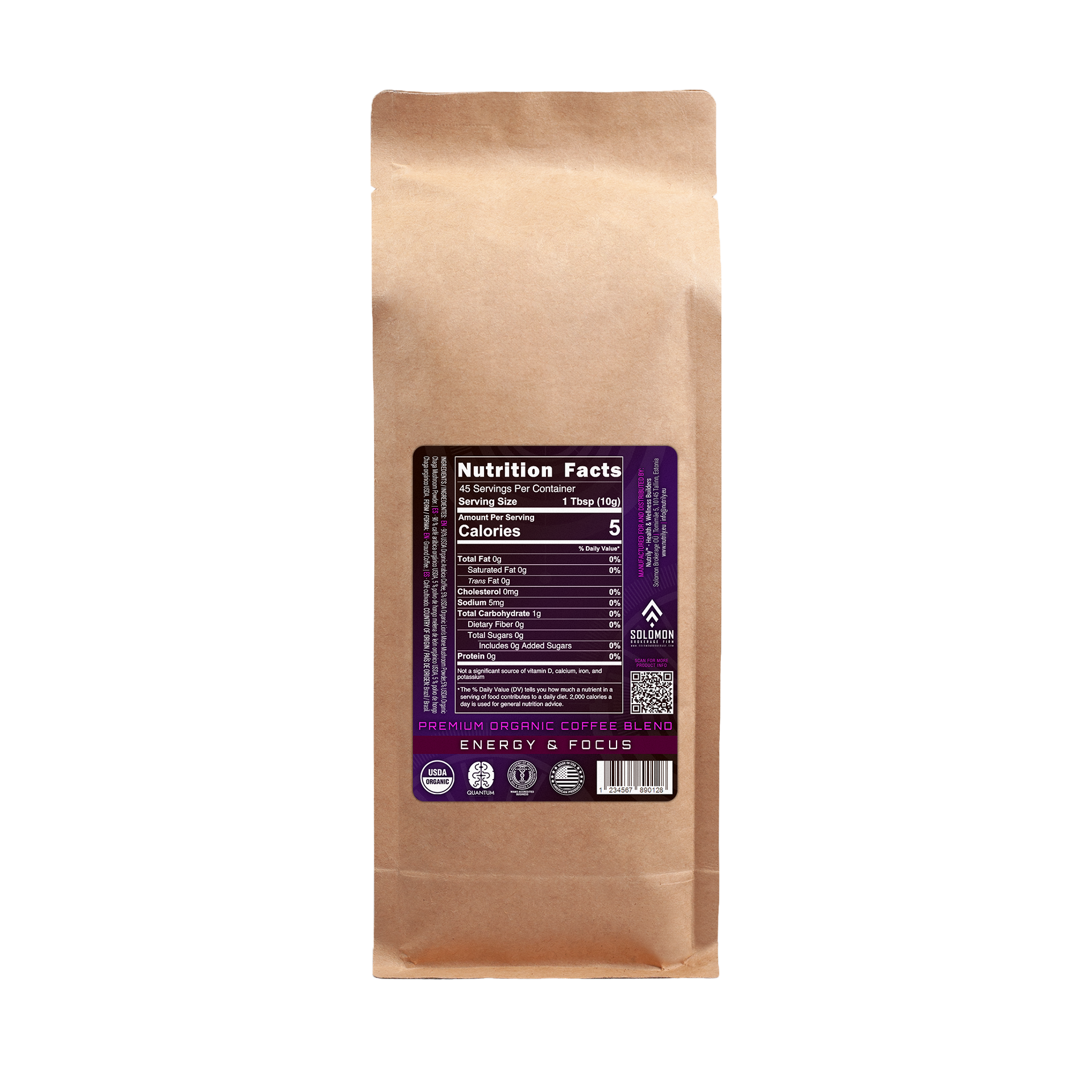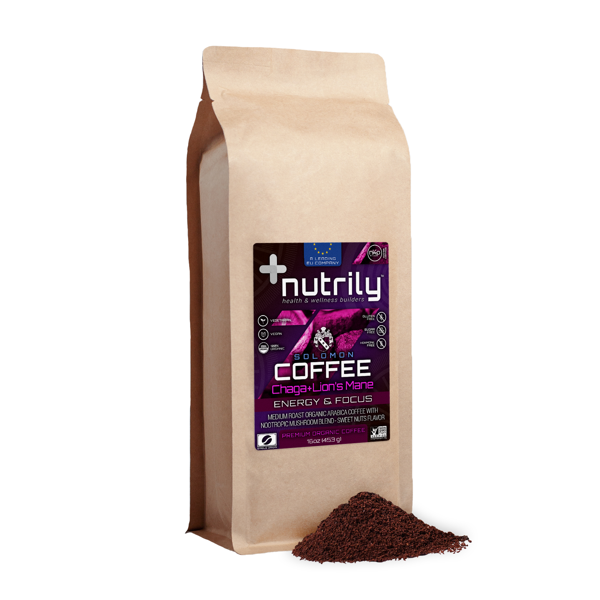 Premium Organic Coffee – Mushroom Fusion – Chaga + Lion’s Mane – Sweet Nuts Flavor – 16oz – Nootropic + Memory + Energy – Solomon Coffee Blend is a Nutrily™ premium organic medium-dark roast coffee blend in the form of ground coffee that helps improve memory, fosters brain health, enhances athletic performance, and boosts energy with its beneficial natural properties. It has a rich antioxidant natural blend with authentic Chaga & Lion’s Mane mushrooms, having additional antibacterial, antiviral, antioxidant, and anti-inflammatory benefits that protect cells from damage. It’s a 100% organic and drug-free nutritional food based on a holistic health approach.