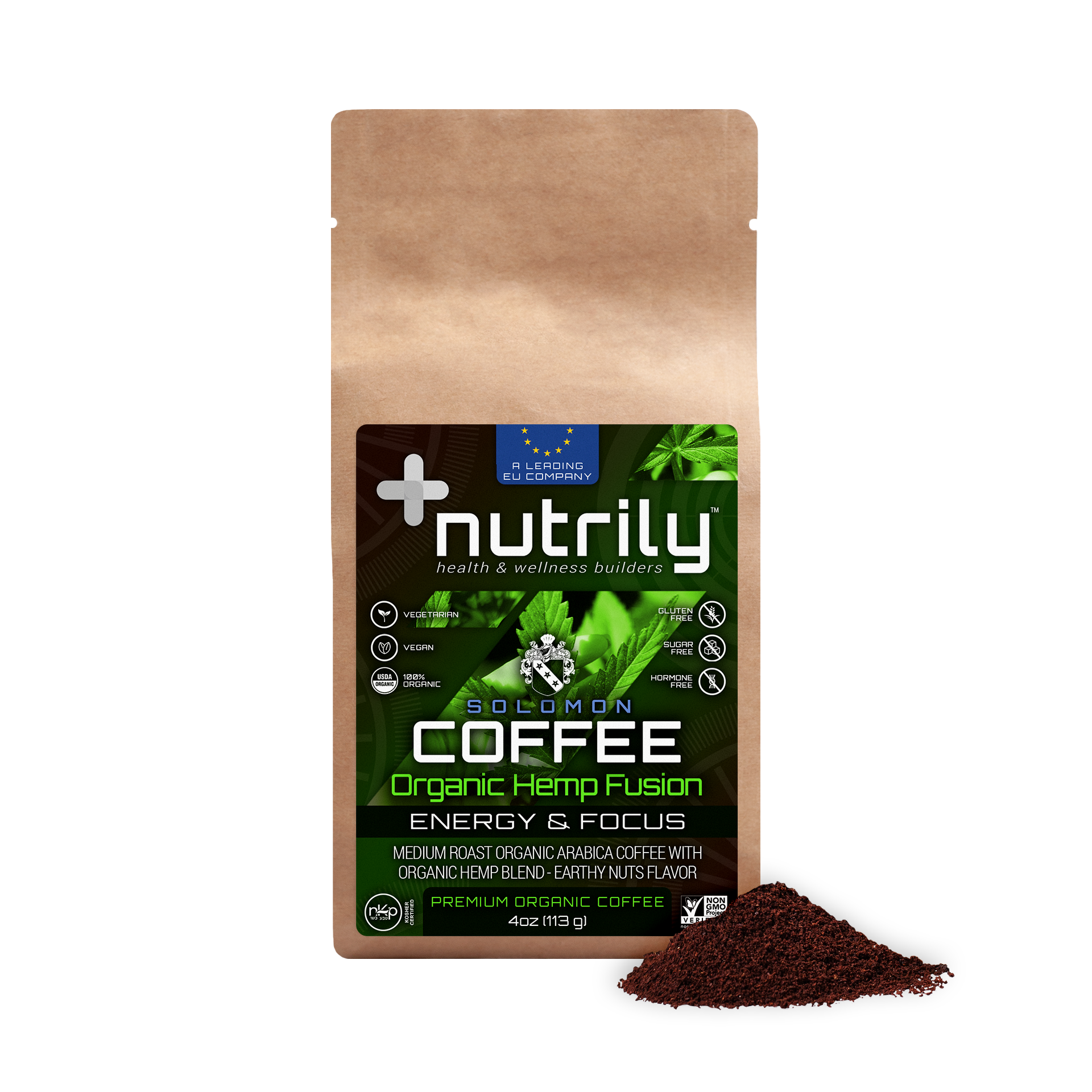 Premium Organic Coffee – Organic Hemp Fusion – Nuts Flavor – 4oz – Memory + Energy – Solomon Coffee Blend is a Nutrily™ premium organic medium-dark roast coffee blend in the form of ground coffee that helps improve memory, fosters brain health, enhances athletic performance, and boosts energy with its beneficial natural properties. It has a rich antioxidant natural blend with authentic organic hemp protein powder including high protein content and 9 essential amino acids, having additional antibacterial, antiviral, antioxidant, and anti-inflammatory benefits that protect cells from damage. It’s a 100% organic and drug-free (no THC or CBD) nutritional food based on a holistic health approach.