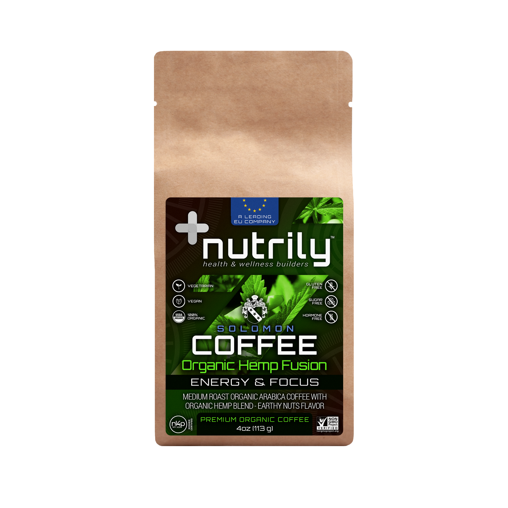 Premium Organic Coffee – Organic Hemp Fusion – Nuts Flavor – 4oz – Hemp Protein – Memory + Energy – Solomon Coffee Blend by Nutrily™ is a premium organic coffee blend that helps support memory & focus, boost energy levels, and improve athletic performance through its blend of authentic organic hemp protein including high protein content, 9 essential amino acids, omega-3, omega-6, stearidonic acid (SDA), and omega-6 Gamma Linolenic Acid (GLA). GLA has been shown to help with cholesterol, inflammation, skin and hair health, balancing hormones, and general heart health, going beyond the benefits found in regular organic roasted coffee. Our premium organic coffee also has antioxidant properties inherent to the coffee itself. Potassium, magnesium, phosphorus, manganese, folate, choline, and sodium are some of the small micronutrients of our premium organic coffee that offers a strong, yet great-tasting experience. Premium Organic Coffee – Organic Hemp Fusion – Nuts Flavor – 4oz – Hemp Protein – Memory + Energy – Solomon Coffee Blend contains natural compounds known to have neuroprotective and brain health benefits, which is why using the premium organic coffee by Nutrily™ is a clean, holistic way to improve energy levels and enhance memory with its nutritional properties.