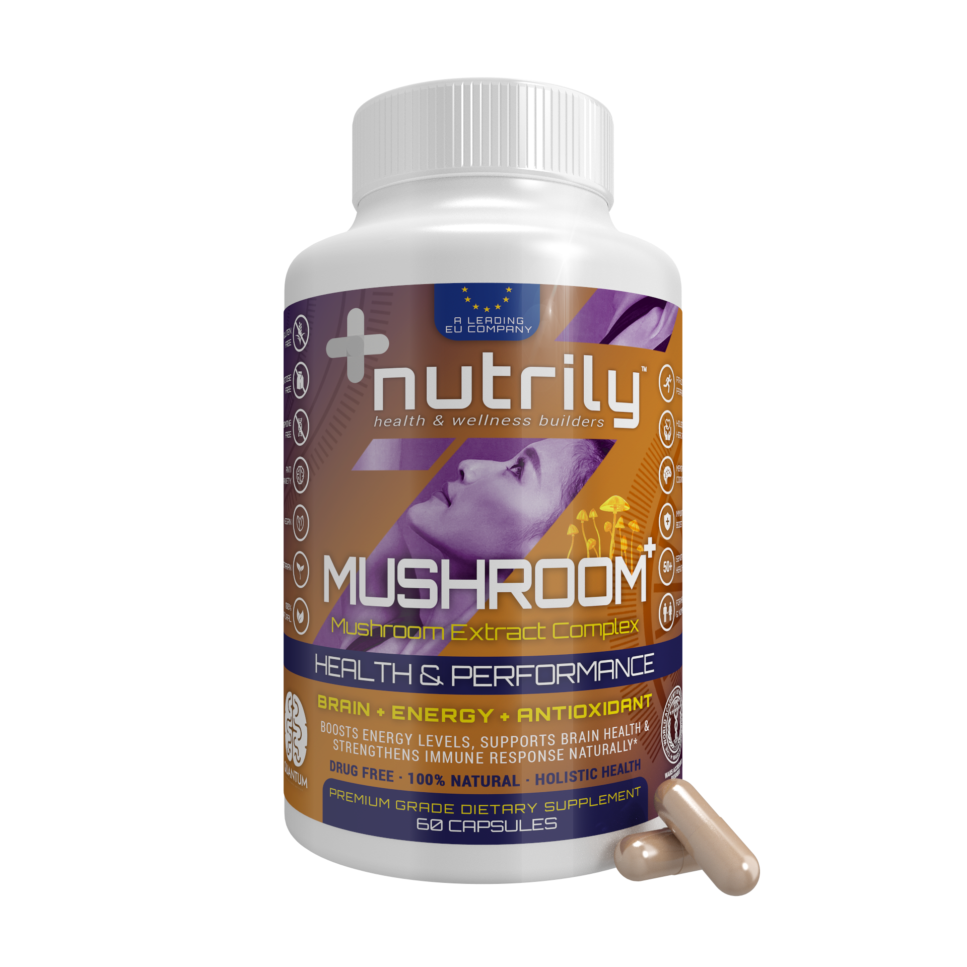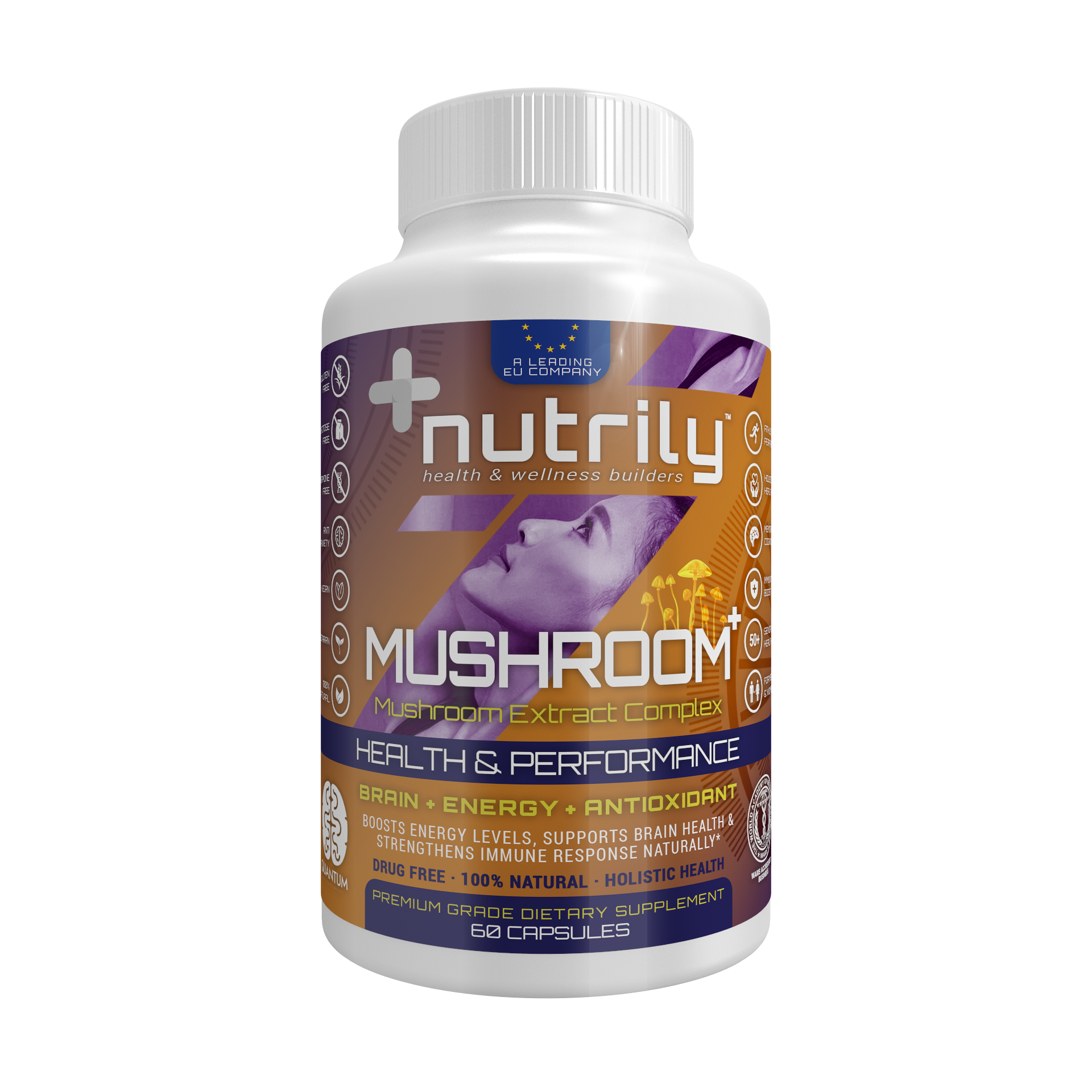 Mushroom+ Mushroom Extract Complex Performance – Brain + Energy + Antioxidant is a Nutrily™ dietary supplement that helps boost energy levels and athletic performance, supports brain health, memory, and cognition, and strengthens the immune system. It has a rich mushroom extract formula that includes Cordyceps Mushroom, Reishi Mushroom, Shiitake Mushroom, Lion’s Mane Mushroom, Maitake Mushroom, Turkey Tail, Chaga Mushroom, Royal Sun Agaricus, White Button Mushroom, and Black Fungus. It’s a 100% natural and drug-free nutritional supplement based on a holistic health approach.
