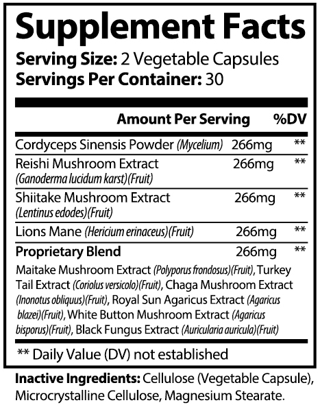 | Ingredients: | Cordyceps Sinesis Powder (Mycelium) 266 mg, Reishi Mushroom Extract Ganoderma lucidum karst) (Fruit) 266 mg, Shiitake Mushroom Exgtract (Lentinus edodes) (Fruit) 266 mg, Lion's Mane (Hericium erinaceus) (Fruit) 266 mg, Proprietary Blend: Maitake Mushroom Extract (Polyporus frondosus) (Fruit), Turkey Tail Extract (Coriolus versicolo) (Fruit), Chaga Mushroom Extract (Inonotus obliquus) (Fruit), Royla Sun Agaricus Extract (Agaricus blazei) (Fruit), White Button Mushroom Extract (Agaricus bisporus) (Fruit), Black Fungus Extract (Auricularia auricula) (Fruit) |