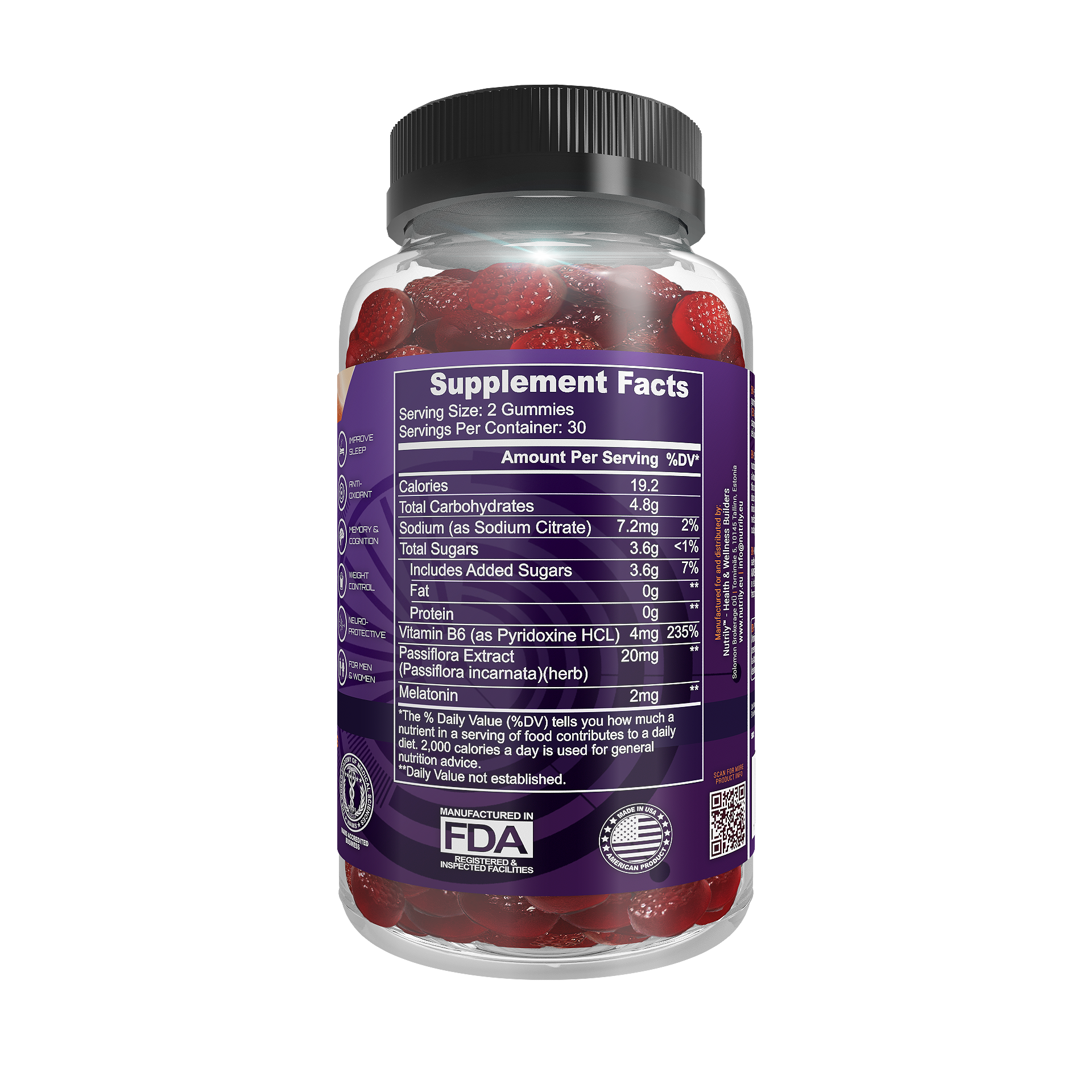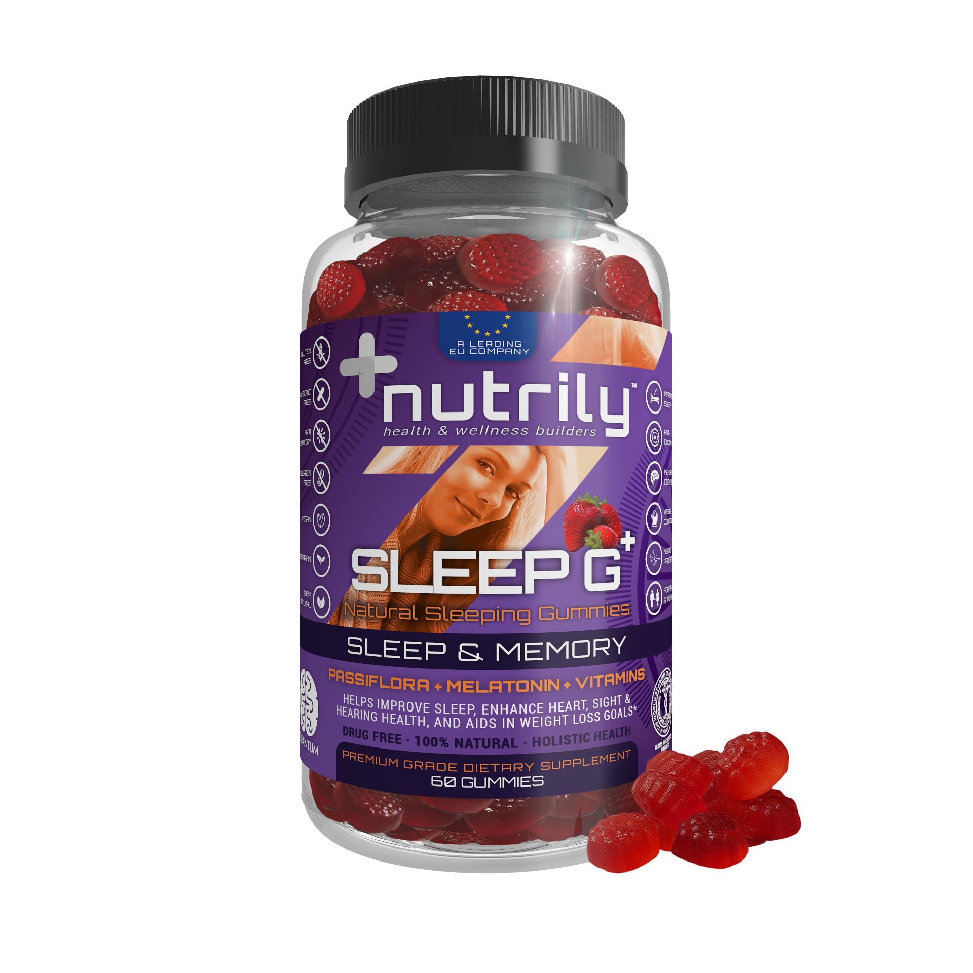 Sleep G+ Natural Sleeping Gummies – Passiflora + Melatonin + Vitamins – Improve Sleep, Sight, Heart, & Hearing + Weight Control is a Nutrily™ dietary supplement in the form of delicious strawberry-flavored gummies that helps improve sleep, fosters brain, heart, eyesight & hearing health, enhances memory & cognition, aids with stress & anxiety, and supports weight control with its beneficial natural properties. It has a rich antioxidant natural formula with Vitamin B6, Passiflora Extract, and Melatonin. It’s a 100% natural and drug-free nutritional supplement based on a holistic health approach.